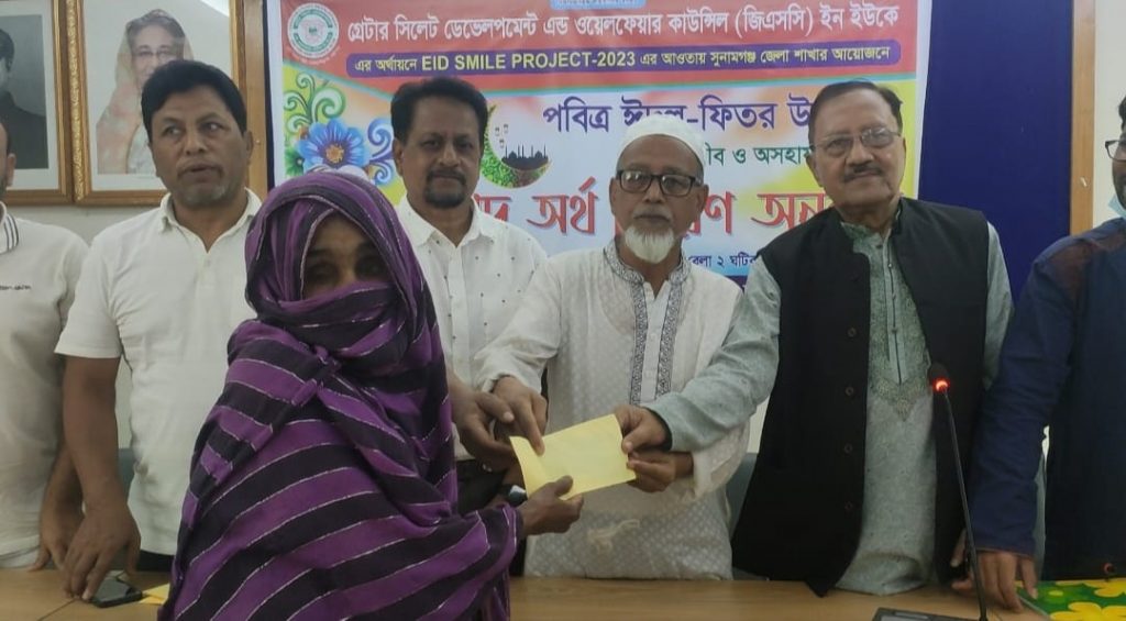 পবিত্র ঈদুল ফিরতের ‘ঈদ আনন্দ’ ভাগাভাগি করতে সুনামগঞ্জের জগন্নাথপুরের বিভিন্ন গ্রামের দরিদ্র অসহায় পরিবারকে নগদ অর্থ সহায়তা প্রদান করেছে গ্রেটার সিলেট ডেভেলপমেন্ট এন্ড ওয়েলফেয়ার কাউন্সিল (জিএসসি) ইন ইউ-কে। সংগঠনটির অর্থায়নে ঈদ স্মাইল প্রজেক্ট ২০২৩ এর আওতায় ঈদুল ফিতর উপলক্ষে গরীব ও অসহায়দের মাঝে নগদ অর্থ বিতরণ করা হয়। এ উপলক্ষে বৃহস্পতিবার দুপুরে উপজেলা পরিষদ সম্মেলন কক্ষে একসভা সভা অনুষ্ঠিত হয়।