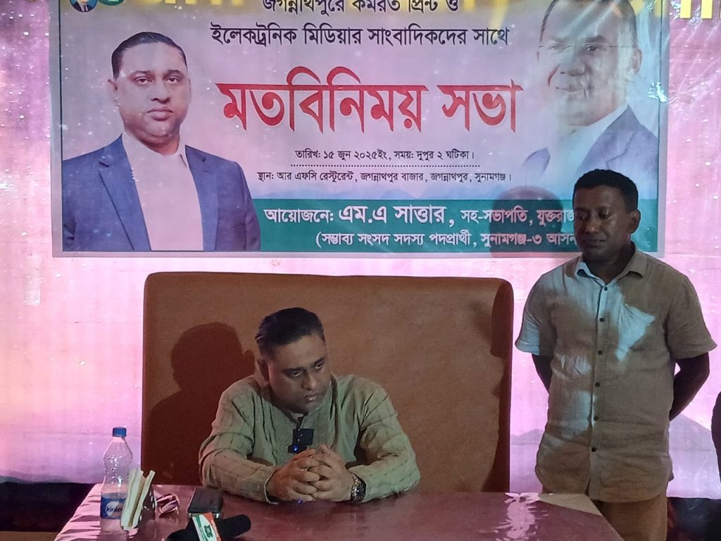 গতকাল রোববার (১৫) বেলা দুইটায় পৌরশহরে আরএফসিতে সাবেক ছাত্রদল নেতা জাহেদ আহমদের পরিচালনায় সভায় এমএ সাত্তার বলেছেন, মানুষের সেবার জন্যে আমার রাজনীতি। জনগনের মৌলিক অধিকার আদায়ে আজীবন কাজ করে যাবার কথা উল্লেখ করে বলেন, এজন্য জাতীয়তাবাদী শক্তির হাতকে শক্তিশালী করার লক্ষ নিয়ে বারবার দেশ মাতৃকার টানে এলাকায় ছুটে আসি। তিনি বলেন, কেন্দ্রীয় নির্দেশনায় মাঠে কাজ করছি। দলীয় মনোনয়ন পেলে এ আসনটি নেত্রীকে উপহার নিতে চাই। বিজয়ী হলে নির্বাচনী এলাকায় উন্নয়নে কোন বৈষম্য করা হবে না। বিএনপির ৩১ দফা বাস্তবায়নের পাশাপাশি অত্র অঞ্চলে বিশেষ করে জগন্নাথপুর ও শান্তিগন্জ উপজেলা উন্নয়নে ভুমিকা পালনের অভিপ্রায় ব্যাক্ত করে তিনি সাংবাদিকদের সহযোগিতা চেয়েছেন।