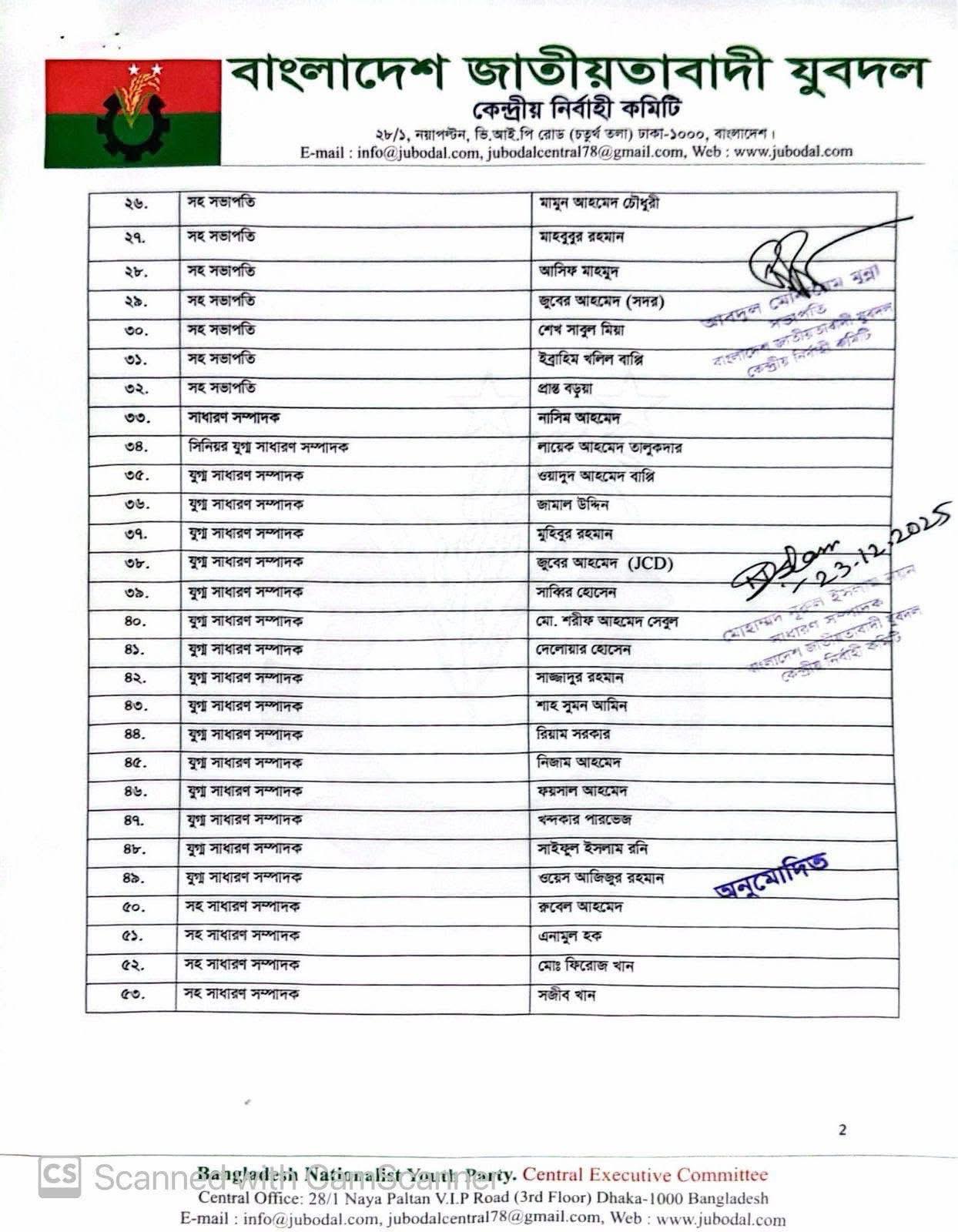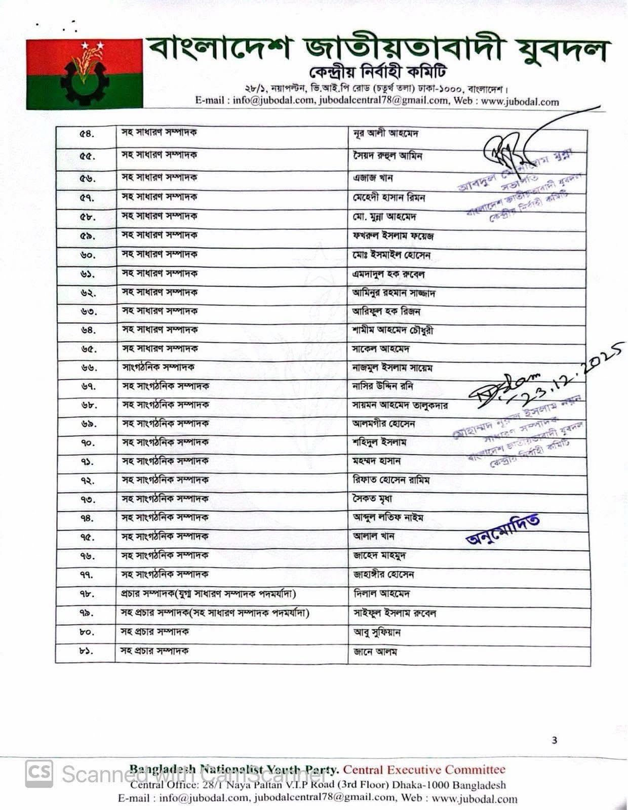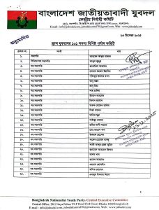 যুবদল কেন্দ্রীয় নির্বাহী কমিটির সভাপতি আব্দুল মোনায়েম মুন্না ও সাধারণ সম্পাদক মোঃ নুরুল ইসলাম নয়নের যৌথ স্বাক্ষরে এই কমিটি অনুমোদন দেওয়া হয়েছে।