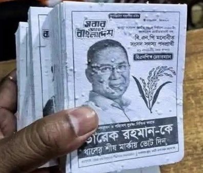 বীজযুক্ত ধানের শীষের লিফলেট নিয়ে প্রচারে তারেক রহমান, মাটিতে পড়লে জন্মাবে গাছ