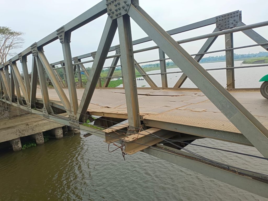 সরেজমিনে সেতুতে গিয়ে দেখা গেছে, সুনামগঞ্জ- ঢাকা আঞ্চলিক এ মহাসড়কের বেইলি সেতুর দুটি পাটাতনের জোড়া খুলে নিচের দিকে দেবে গেছে। নিচের অংশের স্টিলও ভেঙে গেছে। সেতুর উভয়পাড়ে বড় বড় পরিবহনের কয়েকটি গাড়ি আটকা পড়েছে।