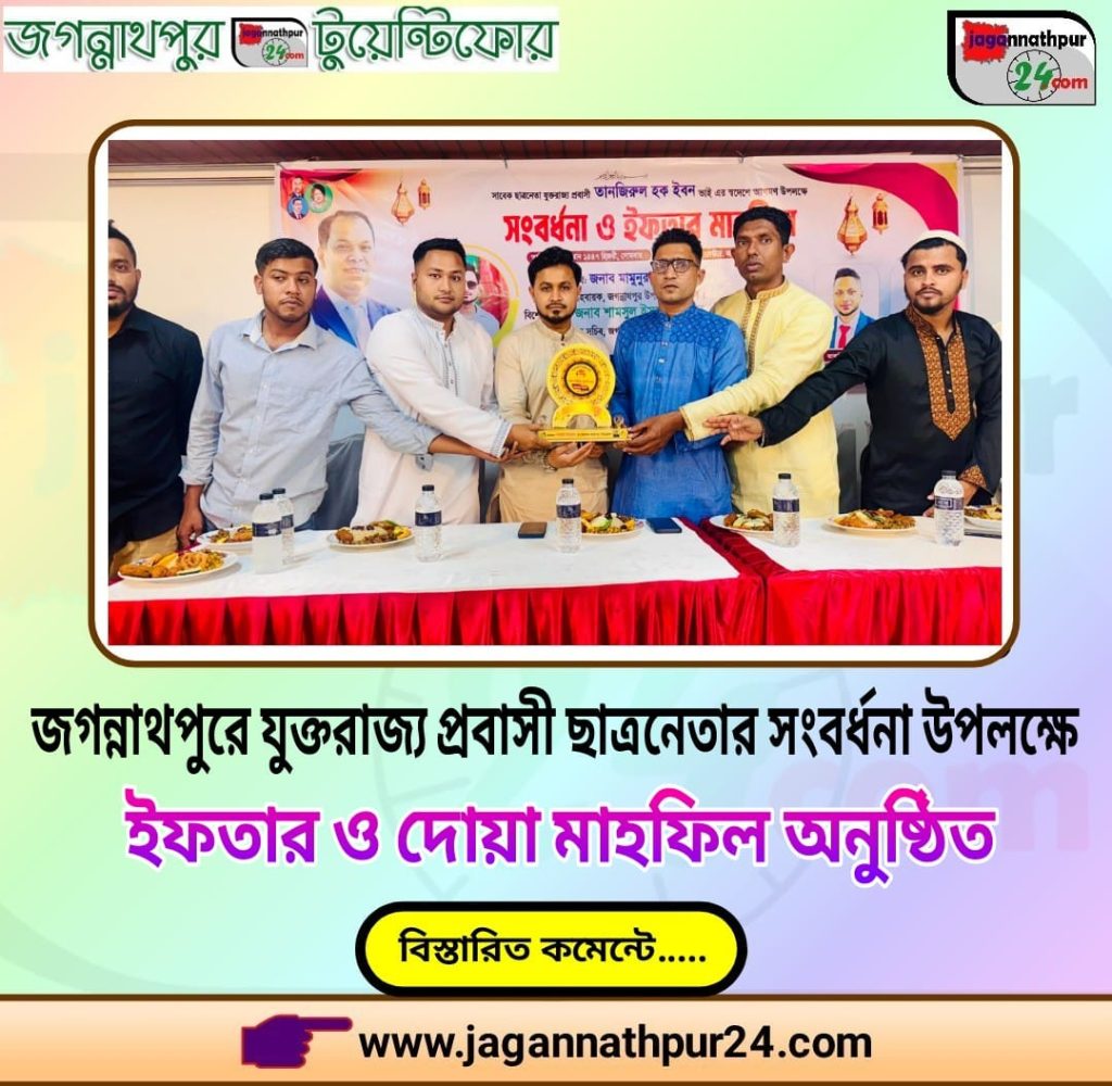 জগন্নাথপুরে যুক্তরাজ্য প্রবাসী ছাত্রনেতার সংবর্ধনা উপলক্ষে ইফতার ও দোয়া মাহফিল অনুষ্ঠিত