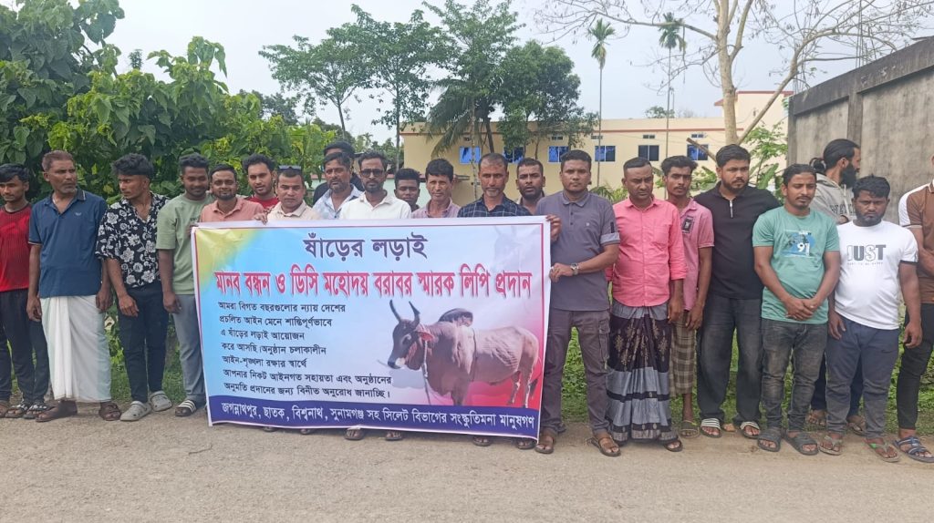 মানববন্ধনে উপস্থিত ছিলেন- জাহান মিয়া, সুমন মিয়া, জুবের আহমদ, জাহির মিয়া, শাহ জাহান মিয়া, হাবিব আহমদ রফিক, সাইফুল ইসলাম, রুমেল মিয়া, সেগুল মিয়া, মাহমদ মিয়া, সোহেল মিয়া ও হারুন মিয়া প্রমুখ এবিষয়ে জানতে চাইলে সুনামগঞ্জ জেলা প্রশাসক ড. মোহাম্মদ ইলিয়াছ মিয়া বলেন, ষাঁড়ের লড়াই আইনীভাবে নিষিদ্ধ, তাই অনুমোদন দেওয়া হয়নি। আইনকে তো সবাই মানতে হবে। কেউ যদি আইন না মেনে এধরণের আয়োজন করে থাকেন সেটা তাদের ব্যাপার। এ বিষয়ে আমরা জানি না।