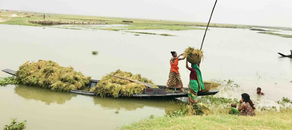 তিনি হাওর থেকে জমির কাটা ধান নৌকায় বোঝাই করে তীরে এনে নৌকা থেকে ধান তুলছিলেন পাড়ে। তাঁকে সহযোহিতা করছিলেন আরেক নারী।